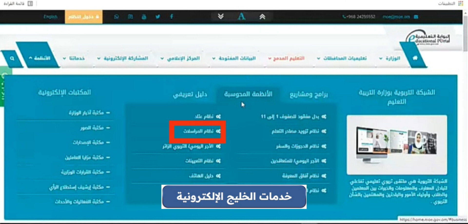 يمكن تسجيل الدخول إلى نظام المراسلات الإلكتروني ضمن البوابة التعليمية في سلطنة عمان عبر اتباع الخطوات التالية: [1]